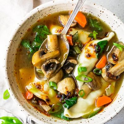 This easy Potsticker Soup is made with frozen chicken potstickers, fresh vegetables, and nourishing bone broth for a fast, delicious dinner. The broth is light and savoury, combined with fresh vegetables and hearty dumplings. This recipe makes a cozy dinner in 30 minutes and can easily be made gluten-free.